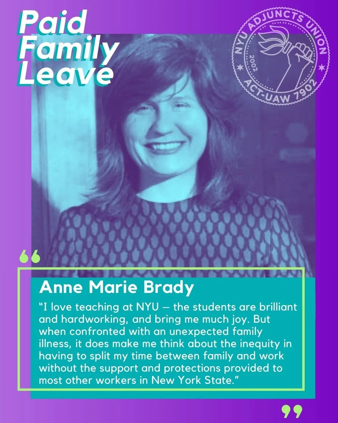 On September 15th, members of the NYU Adjuncts Union delivered a letter demanding Paid Family Leave signed by a representative group of adjuncts across campus. The more of us who come together and add our names, the more power we have to ensure that we win this PFL for our colleagues and their families. Thousands of unionized adjuncts around the city have already won this essential right, and we can join them by urging NYU to commit to timely, robust implementation of PFL. Read our letter here.